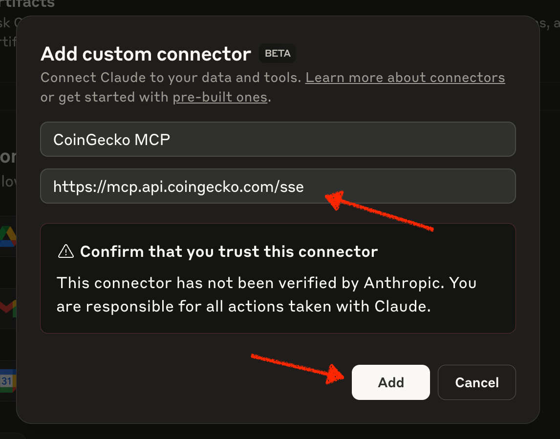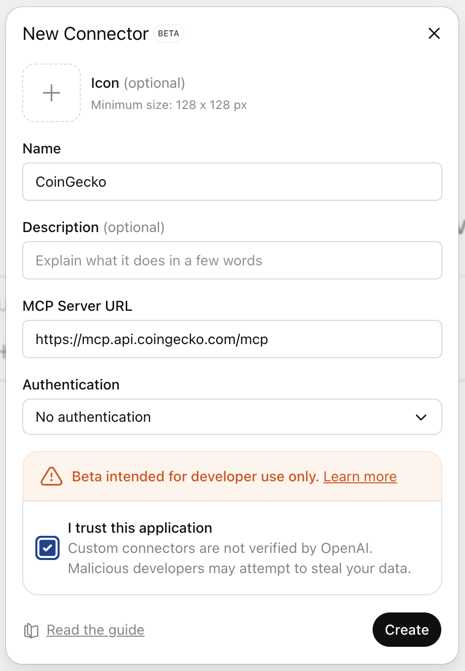 In the Connectors modal, choose “Create” and enter the CoinGecko MCP server info