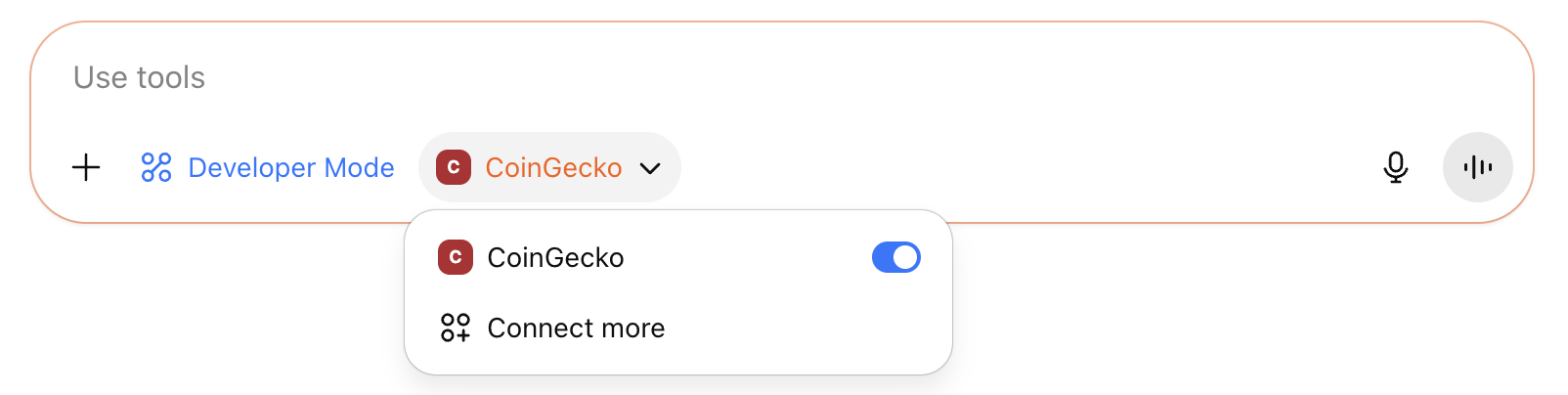Before prompting, choose ”+” > More > Developer Mode > CoinGecko MCP tool must be turned on