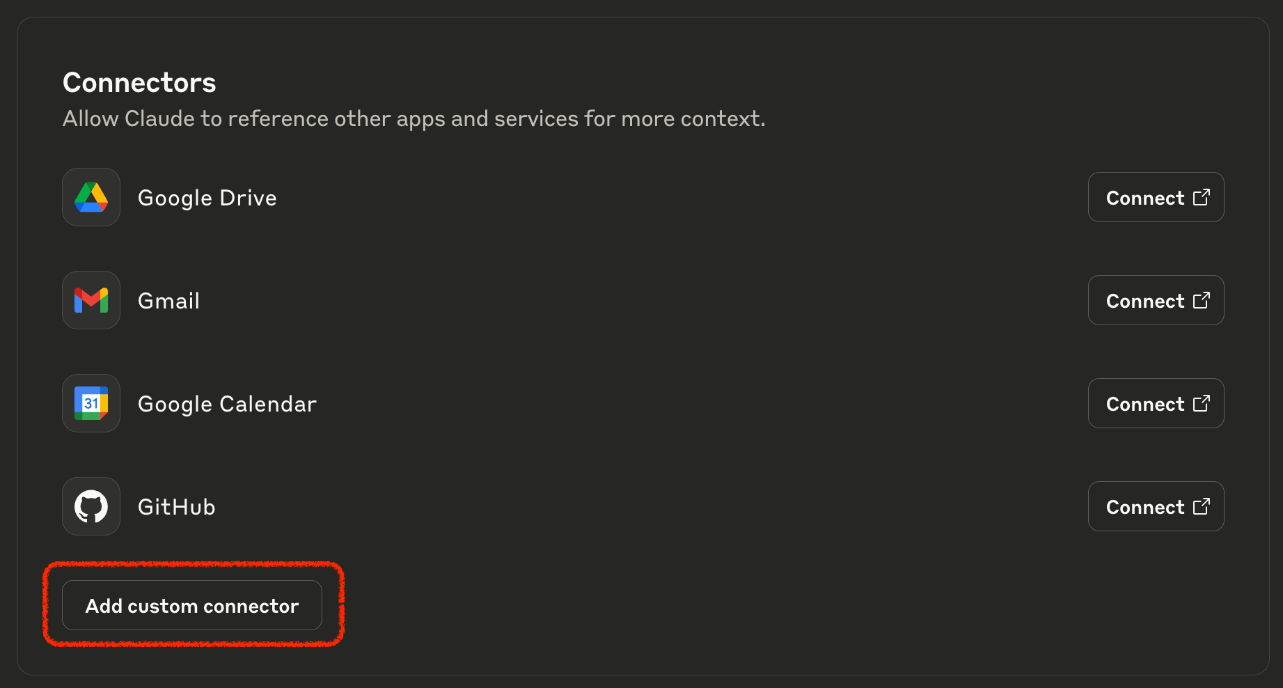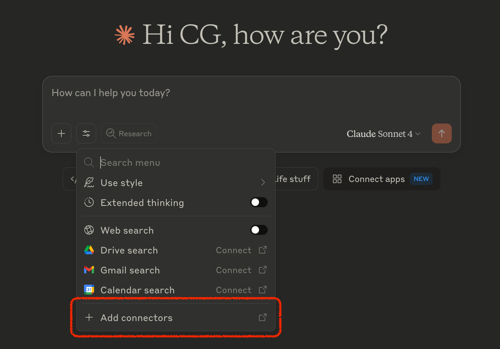 In Claude (claude.ai or the Desktop app), click on ‘Add connectors’ in your chat.