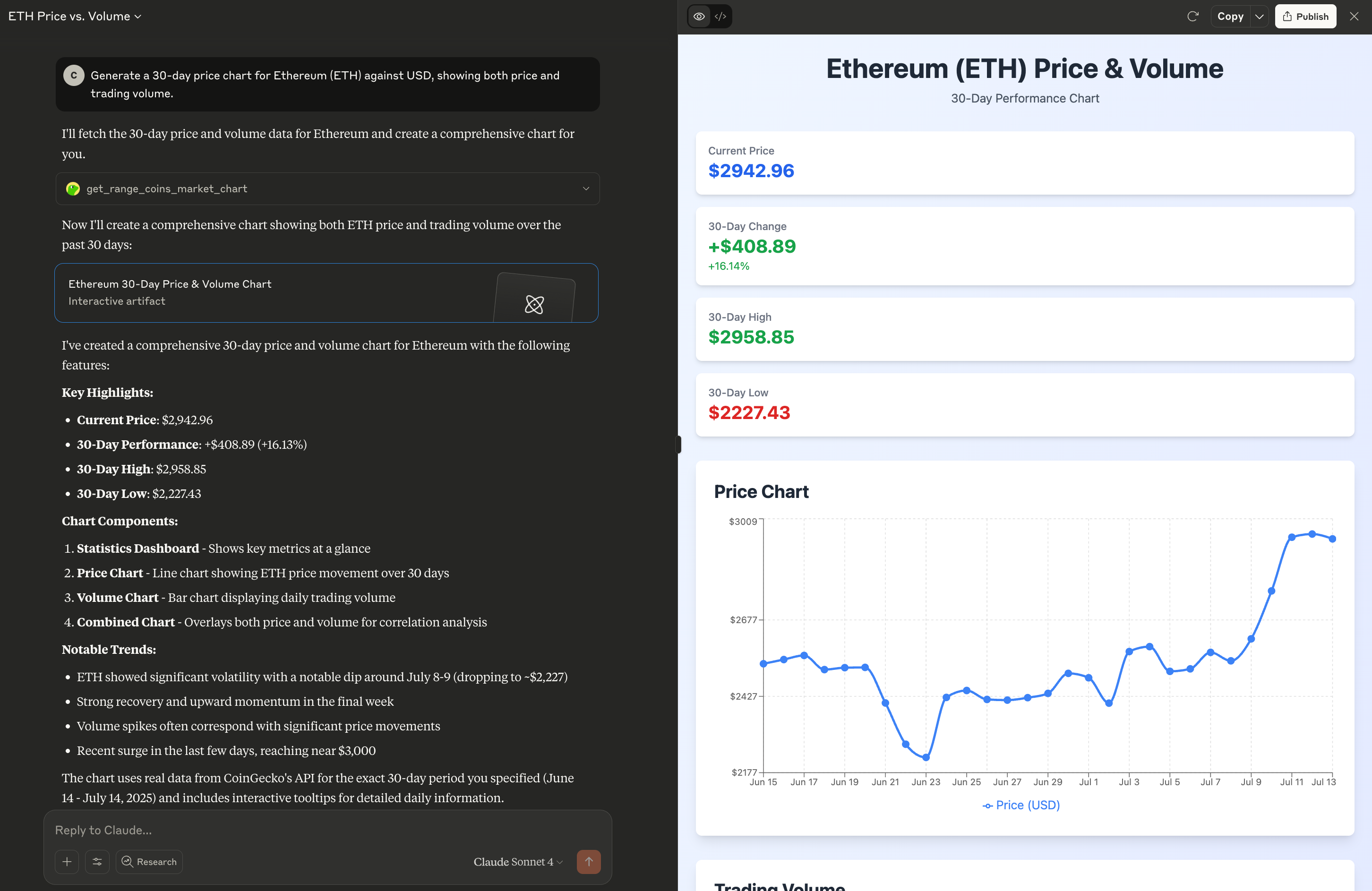 - Generate a 30-day price chart for Ethereum (ETH) against USD, showing both price and trading volume.