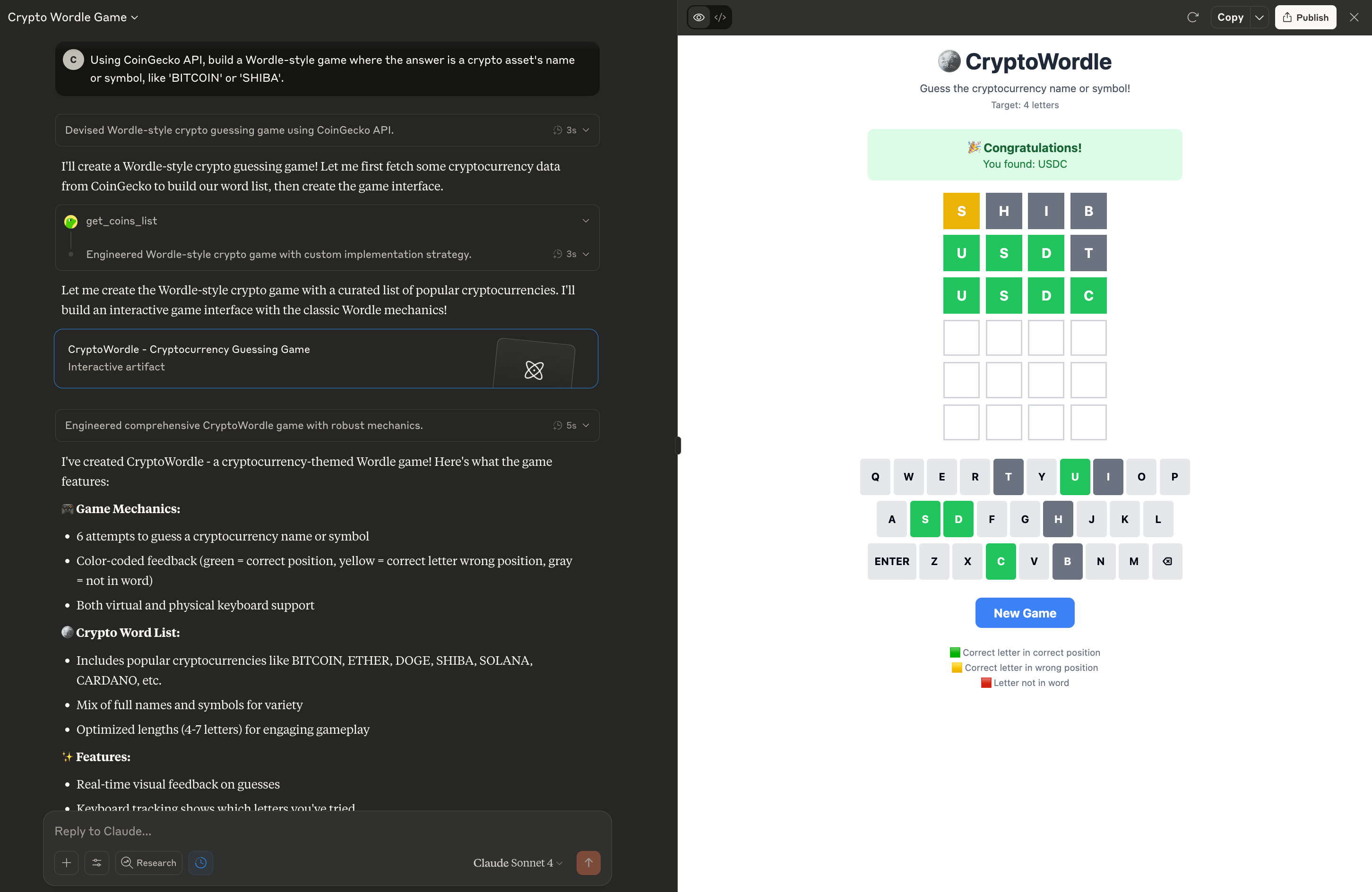 Try it here: claude.ai/public/artifacts - Build a Wordle-style game where the answer is a crypto asset’s name or symbol, like ‘BITCOIN’ or ‘SHIBA’.