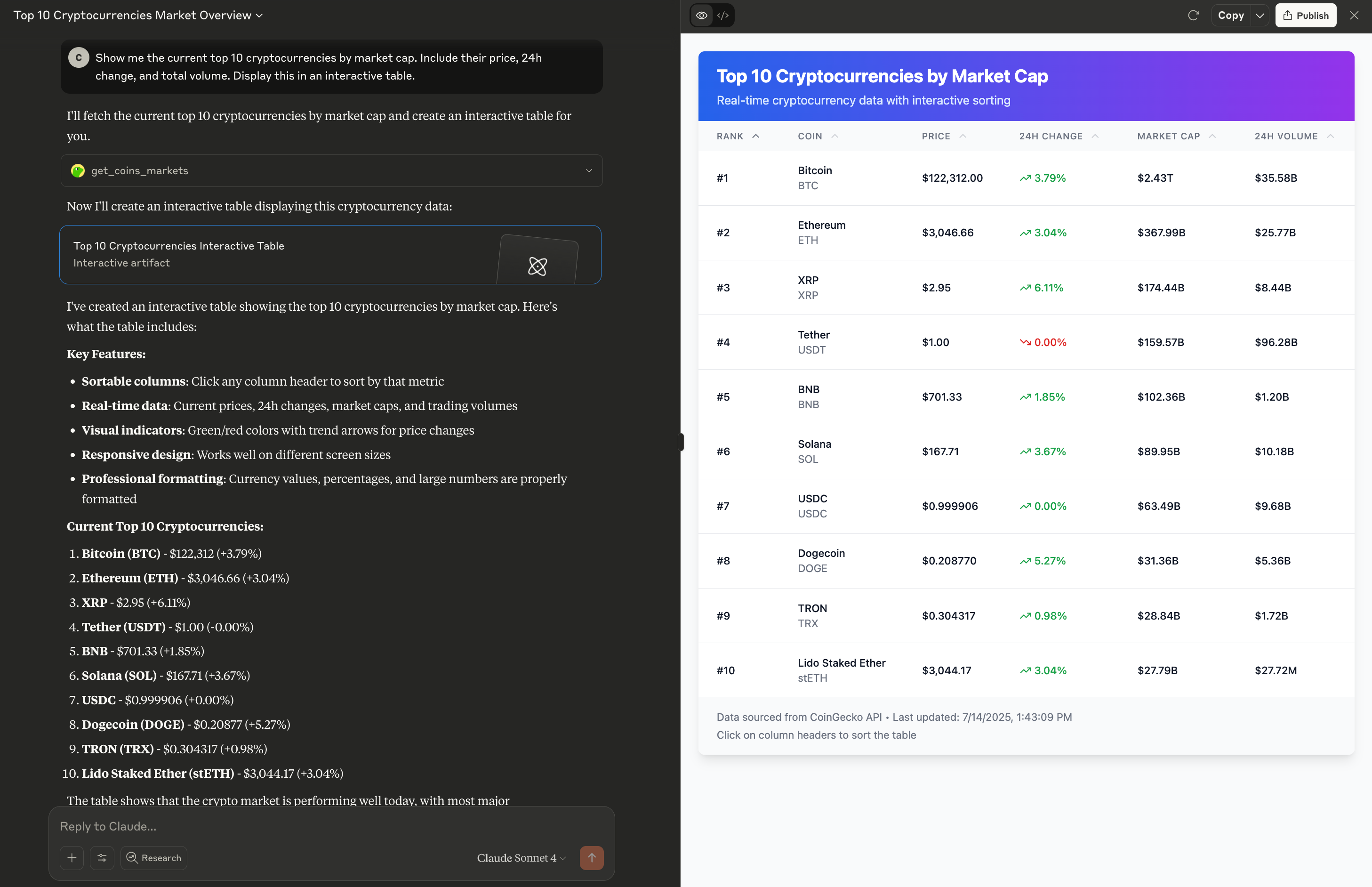 - Show me the current top 10 cryptocurrencies by market cap. Include their price, 24h change, and total volume. Display this in an interactive table.