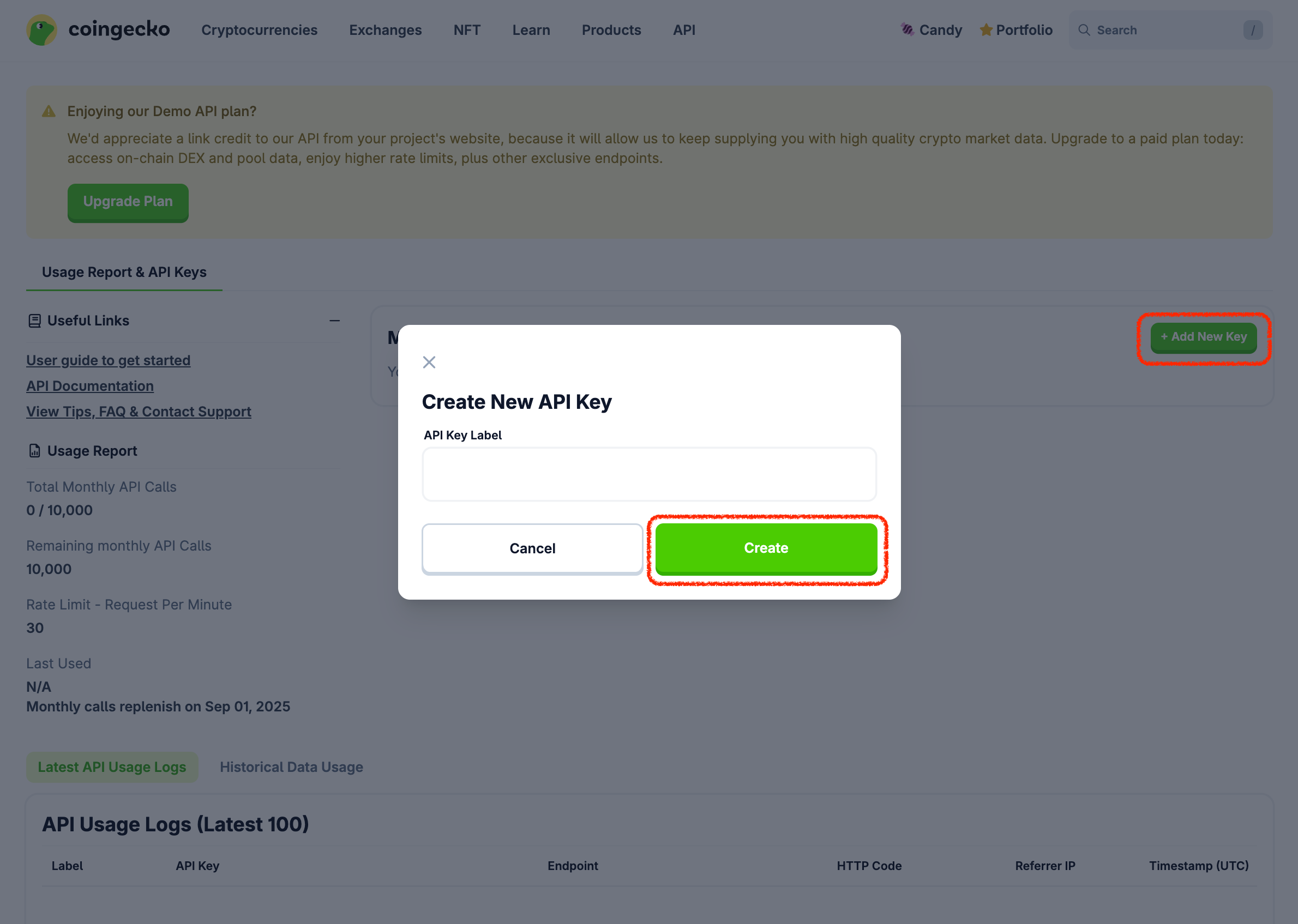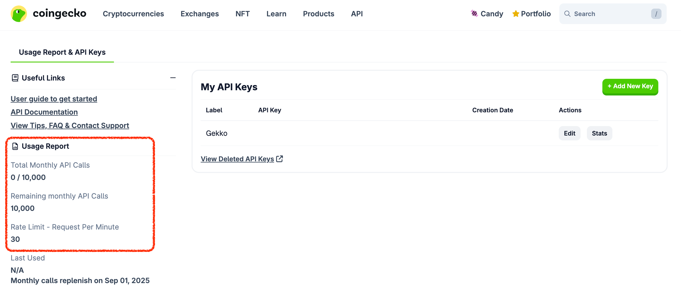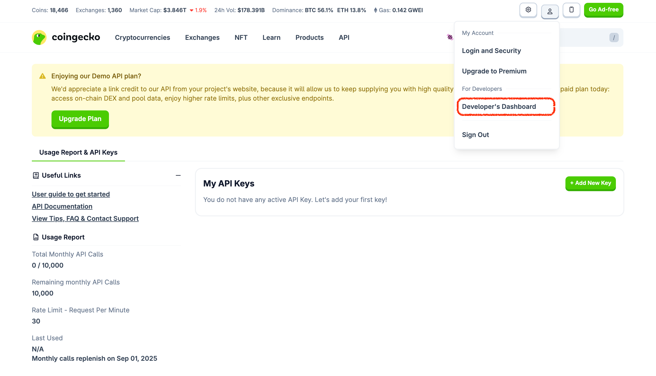 Once you have signed up and logged in to your CoinGecko account, go to Developer Dashboard: