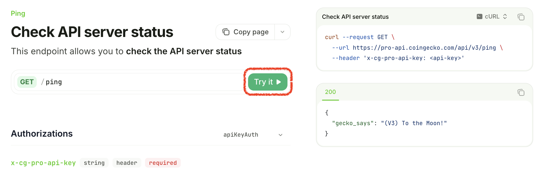 https://pro-api.coingecko.com/api/v3/ping?x_cg_pro_api_key=YOUR_API_KEY - Demo API: