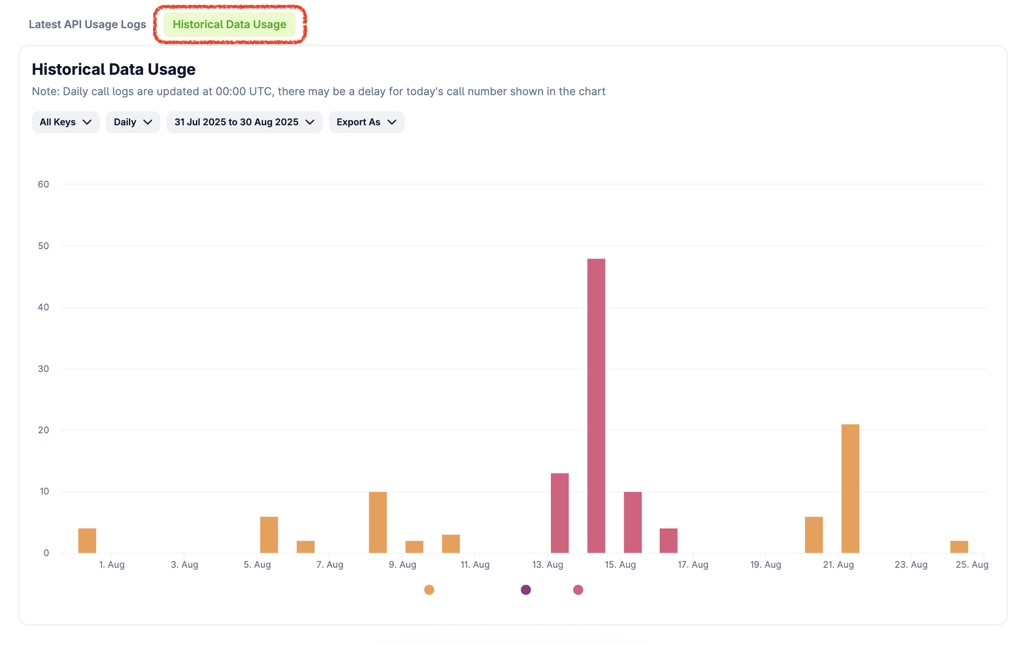 You can also check your full historical usage by specifying “API Keys”, “timeframe” or “date range”. You may export as CSV for more comprehensive view.
